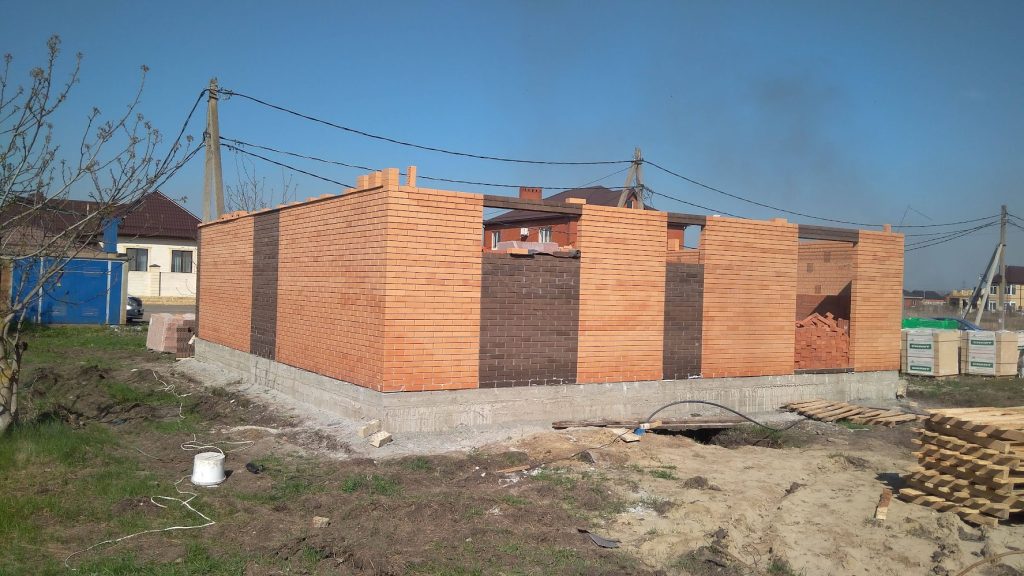 К сожалению, не сохранились фото вертикальных сердечников, но они расставлены через каждые 4–4,5 м. (На фото видно арматурные штыри в середине стены дома.) Благодаря армопоясу и сердечникам, дом получается с полностью монолитным каркасом. Не страшны сейсмические колебания.